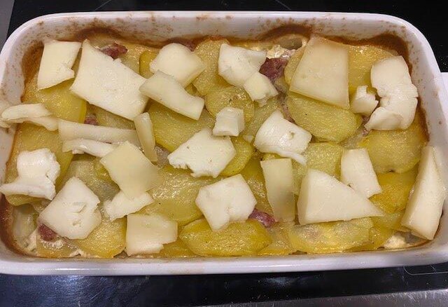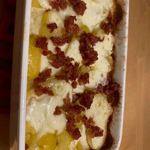 Kartoffelgratin mit karamellisierten Zwiebeln, Salsiccia & Taleggio Feb. 15, 2026 | in Allgemein, Rezepte Kartoffelgratin mit karamellisierter Zwiebel, Salsiccia & Taleggio Wieder mal ein Lieblingsgericht fürs Wochenende - ideal für einen entspannten Spätnachmittag.Leicht zu machen, aber zeitintensiv - ich habe mir zwischendurch die Damenabfahrten der Winterolympiade in Cortina angesehen und immer mal wieder zu den Zwiebeln geschaut... Fein geschichtete Kartoffeln treffen auf langsam karamellisierte Zwiebeln und Salsiccia – eine herzhafte Kombination mit süßlich-tiefen Aromen und mediterranem Charakter. Das Gratin backt zunächst goldbraun und saftig durch, sodass sich die Aromen perfekt verbinden.Erst ganz zum Schluss wird der Taleggio in Scheiben auf das heiße Gratin gelegt und für etwa vier Minuten ins Rohr geschoben. So schmilzt er sanft an, ohne seine feine Struktur zu verlieren, und verleiht dem Gericht eine besonders cremige, aromatisch-milde Note. Rezept drucken 2 hours Std 45 Minuten Min. Portionen 4 Personen Sie brauchen1 Auflaufform, rund 26cm alternativ auch eckigAlufolie Zutaten 1x2x3x1 kg Kartoffeln 700 gr gelbe Zwiebeln 200 gr Taleggio-Käse250 gr Salsiccia Fresca frische italienische Rohbratwurst 200 gr Obers 150 gr Milch 50-60 gr Butter frischer Thymian, mehrere Zweige Alternative: 2-3 EL getrocknter Thymian 1 Prise geriebene MuskatnussOlivenöl Zucker SalzPfeffer Zubereitung Kartoffeln schälen und in 3-5 mm feine Scheiben schneiden Die Kartoffelscheiben in kochendem Salzwasser ca 2-3 Minuten kochen , abseihen und auf Geschirrtuch zum Auskühlen /Trocknen auflegen Die Zwiebeln schälen und in 2-3mm dicke Scheiben schneiden. Butter in einer großen Pfanne schmelzen lassen, die Zwiebelscheiben und Thymian hinzufügen. Leicht salzen und 25 bis 30 Minuten langsam bei niedriger Hitze schmoren lassen. So verlieren die Zwiebeln ihre Schärfe, werden braun und entwickeln eigene Süsse und Aromen. Hin und wieder umrühren und kontrollieren, daß die Zwiebeln sanft vor sich hin schmoren, aber nicht zu dunkel werden. Im Zweifelsfall lieber Hitze reduzieren. Nach 25 Minuten 1 Esslöffel Zucker hinzugeben und weitere 10-15 Minuten schmoren lassen. Die Zwiebeln haben nach dieser Zeit einiges an Volumen verloren, aber viel an Aromen gewonnen und sind idealweise goldbraun geworden. Inzwischen die Haut der Salsiccia entfernen und das Fleisch in kleine Stückchen schneiden. 50-60 gr Salsiccia beiseite geben (wird später angebraten). Backrohr auf 180 Grad vorheizen. Eine Auflaufform (rund Durchmesser ca 26m, geht aber auch eckig, siehe meine Fotos) mit etwas Olivenöl einfetten. Es sind 3 Schichten mit Kartoffelscheiben geplant. Am Boden der Auflaufform die erste Schicht mit Kartoffelscheiben auflegen, die Hälfte der karamellisierten Zwiebeln darauf verteilen. Dann die Hälfte der rohen Salsicciastückchen verteilen. Nächste Lage Kartoffelscheiben, Zwiebel und Salsiccia aufschichten, mit einer dritten Lage Kartoffelscheiben enden, Obers und Milch zusammen aufkochen, dabei etwas salzen, pfeffern und mit Prise Muskatnuss würzen. Die Obers-Milch-Mischung sofort auf die geschichteten Kartoffeln gießen. Auflaufform mit Alufolie abdecken. Im vorgeheizten Rohr 1 Stunde backen, 180 Grad, Ober-Unterhitze. Dann Alufolie entfernen und weitere 20 Minuten backen.Inzwischen den Taleggio-Käse von seiner Rinde befreien und in Würfel oder Scheiben schneiden. Die restliche Salsiccia in einer Pfanne golden knusprig anbraten und beiseite stellen. Zum Schluss den Käse und die gebratene Salsiccia auf dem Kartoffelgratin verteilen und 4 Minuten fertigbacken. Vor dem Servieren ein paar Minuten abkühlen lassen. Buon Appetito! Dazu könnte ein guter Rotwein aus Sardinien oder dem Piemont passen. Tried this recipe?Let us know how it was!