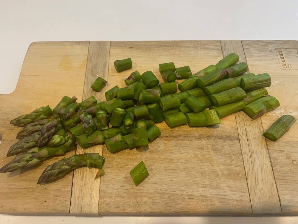 • In der Zwischenzeit den Spargel waschen, holzige Enden abschneiden, Spargel in 2cm lange Stücke schneiden.
