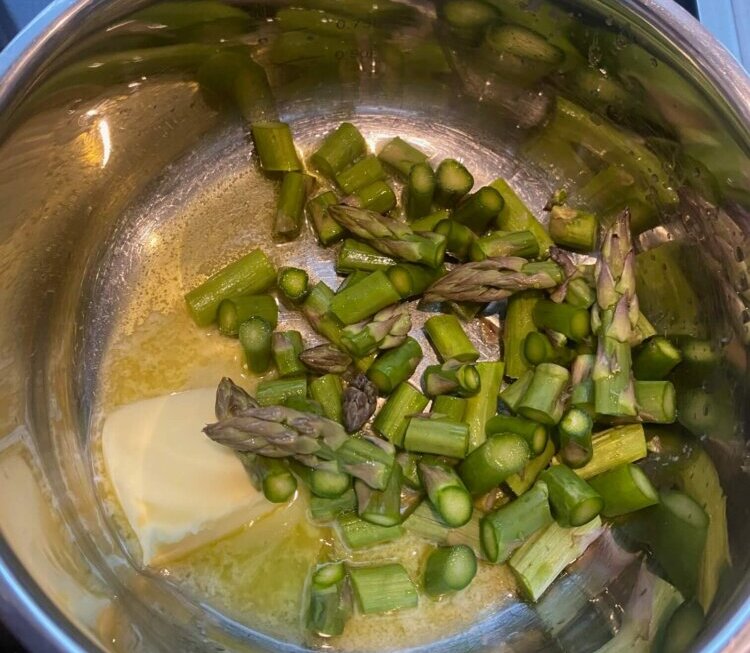 • Butter in einem kleinen Topf schmelzen, 1 EL Wasser zugeben, Spargelstücke dazu und ca 10 Min leicht köcheln lassen. Beiseite stellen und abkühlen lassen.