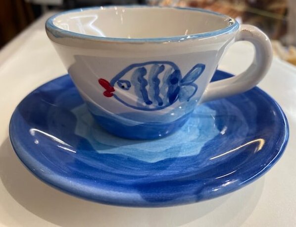 Diese handgefertigte Espressotasse aus der Toskana vereint traditionelle italienische Keramikkunst mit mediterranem Charme. Das kunstvolle blaue Dekor wird durch ein liebevoll gestaltetes Fischmotiv mit rotem Mund ergänzt – ein detailreicher Blickfang mit maritimem Charakter.