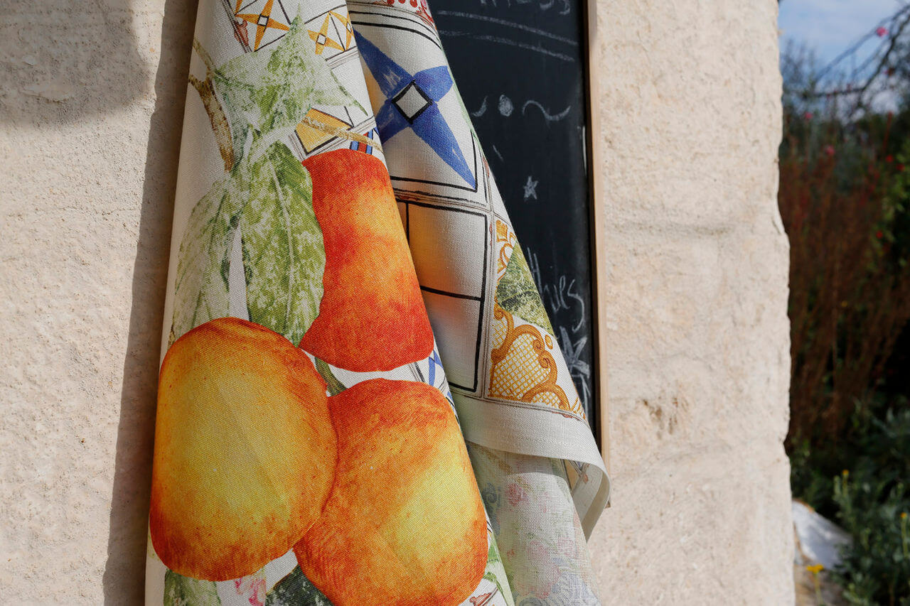 Geometrische Motive in Kombination mit farbenprächtigen Orangen – dieses Geschirrtuch verbreitet gute Laune in der Küche !