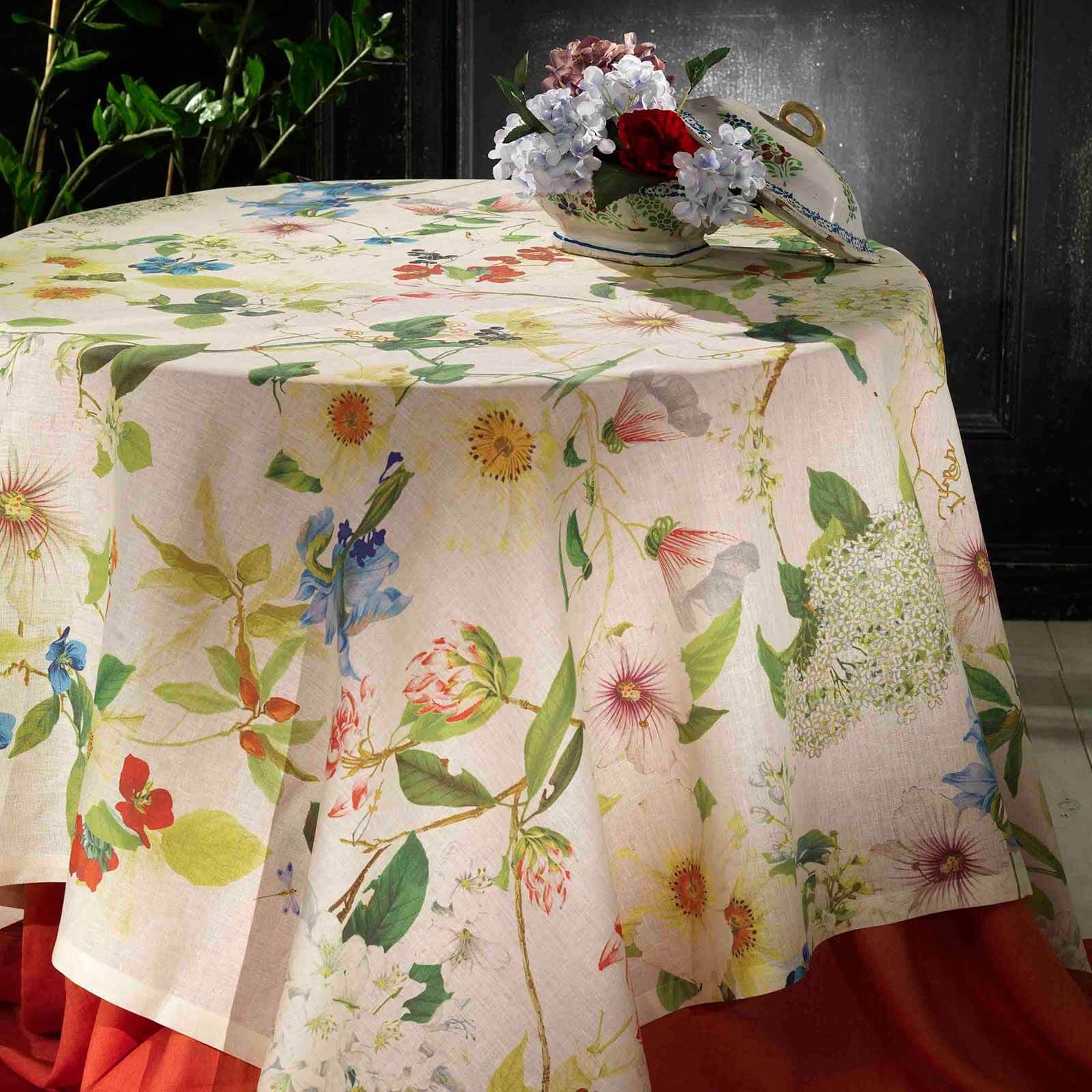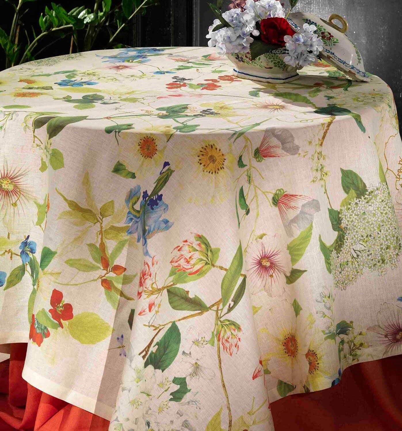 Sommergefühle pur – dieses wunderschöne Leinentischtuch “Ibisco ” mit den Massen 170×170 cm verschönert jedes Ambiente.