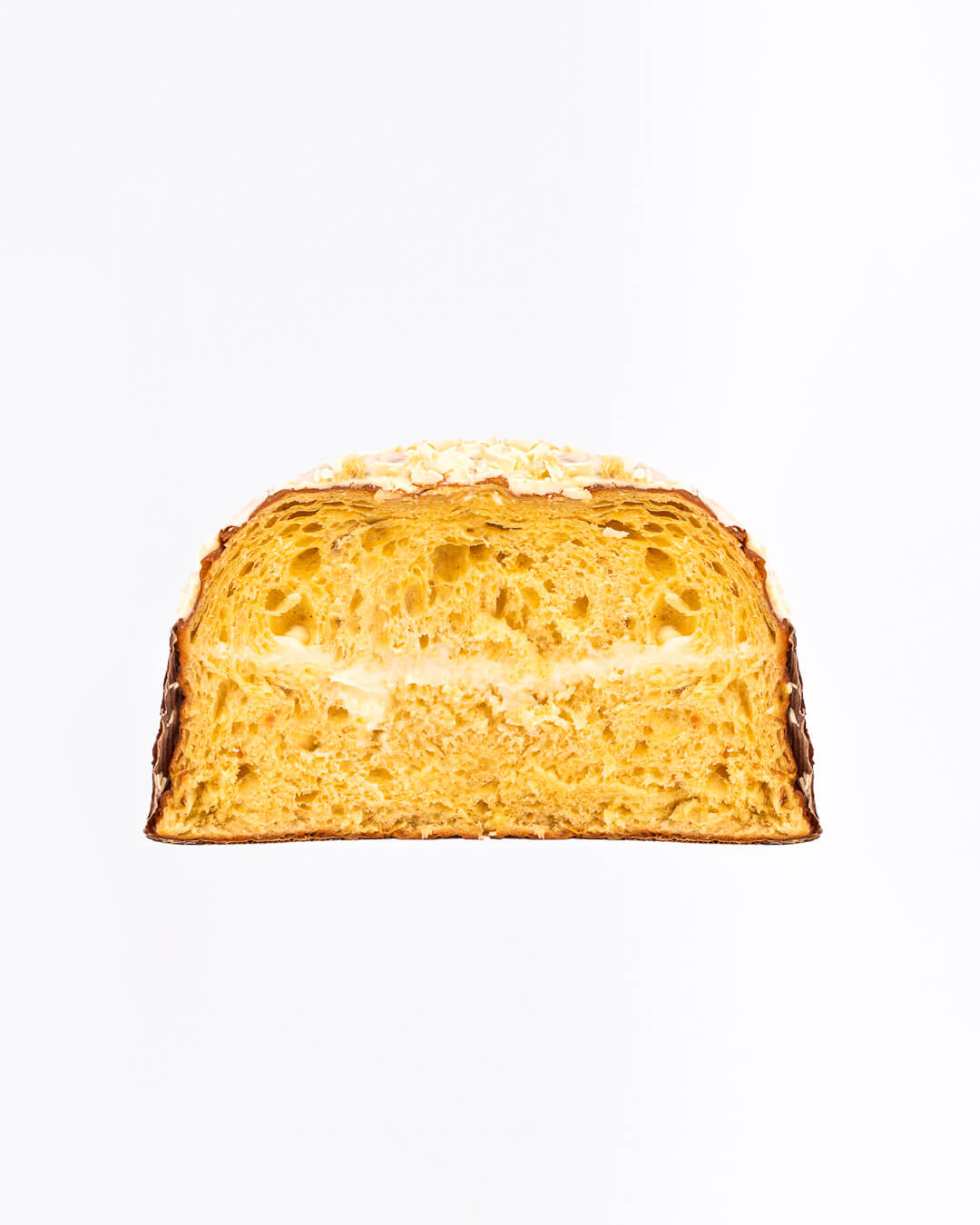 Panettone mit kandierten Zitronenstückchen, Zitronencremefüllung und einer Glasur aus weisser Schokolade