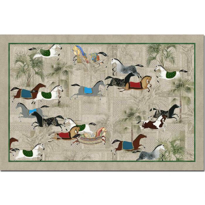 Pferdemotive zieren diesen hübschen Teppich, der zum größten Teil aus recyceltem Polyester besteht.