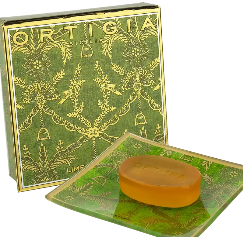 Dieses exklusive Set aus einer 40 g Limonen-Glycerin-Seife und einem wunderschön dekorierten Glasteller mit Ortigia-Serigraphie ist eine tolle Geschenksidee. Jedes Badezimmer wird mit diesem luxuriösen italienischen Kunstobjekt verschönert.